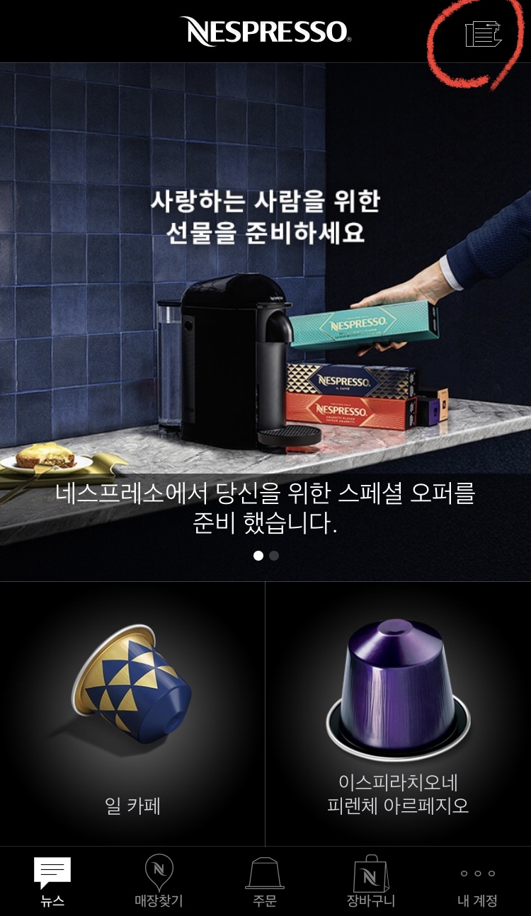 1) 네스프레소 공식 어플리케이션을 무료 다운로드 받아서 실행합니다.